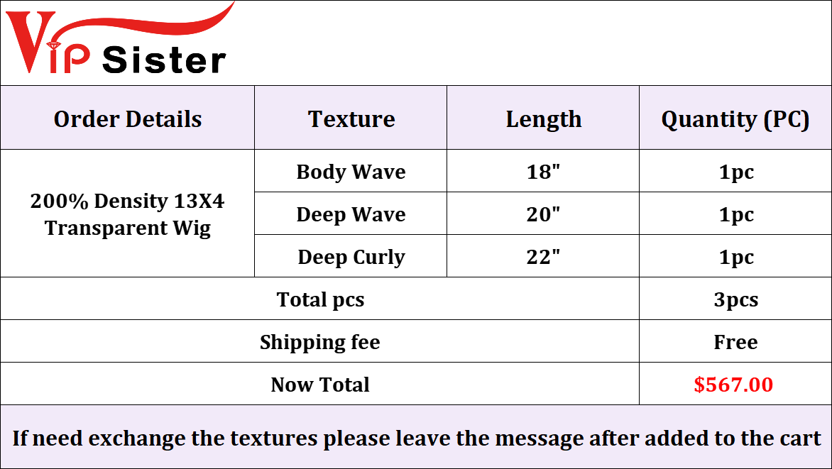 Vipsister 3PCS 13×4 Transparent Lace Frontal Wig Deal Free Shipping