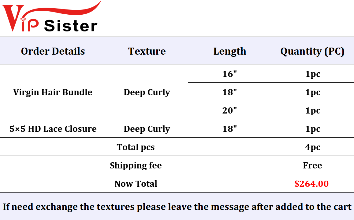 Vipsister 3PCS Virgin Bundles And 1PCS 5×5 HD Lace Closure Deal Free Shipping,Sample +Wholesale Package