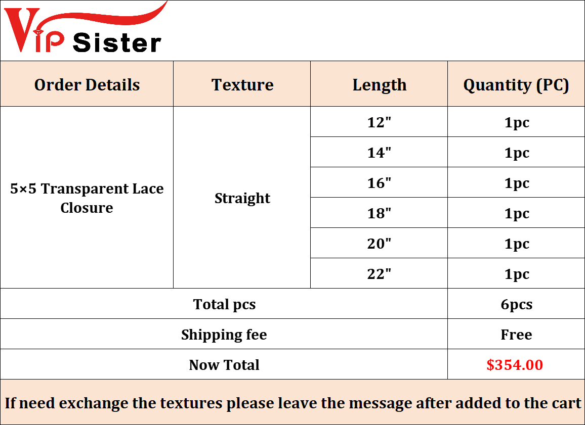 Vipsister 6 pcs indian hair 5×5 transparent closure total 354$ free shipping