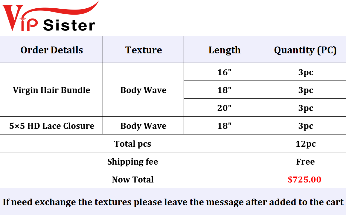 Vipsister 9PCS Virgin Bundles And 3PCS 5×5 HD Lace Closure Deal Free Shipping,Sample +Wholesale Package