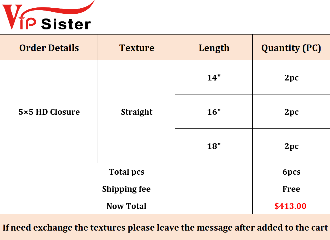Vipsister 6 pcs indian hair 5×5 hd closure total 413$ free shipping